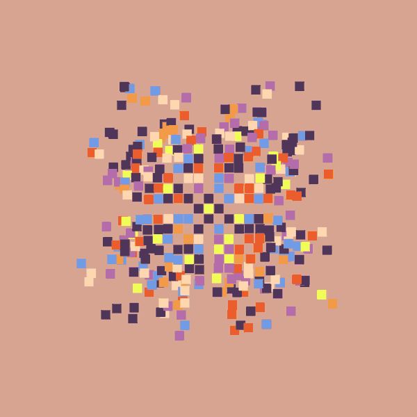 This image is an abstract composition made up of numerous small, colored squares scattered across a muted background. The design utilizes a pixelated or mosaic effect to create texture and visual interest through the juxtaposition of various hues.