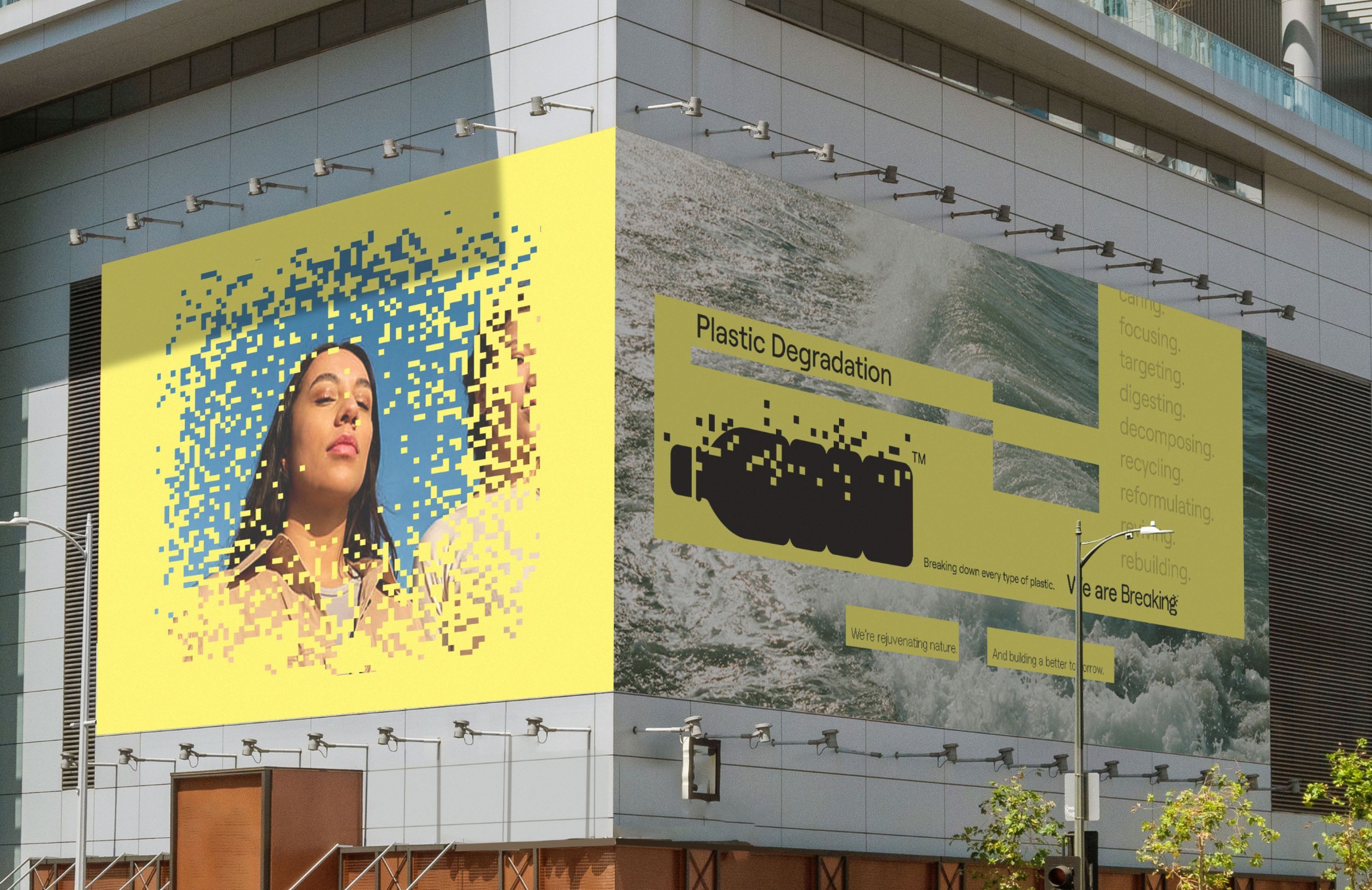 A bold, contemporary public art installation featuring large-scale digital billboards with vibrant yellow backgrounds and pixelated imagery. The design combines environmental awareness messaging with striking visual contrast, utilizing bright color blocking and fragmented digital aesthetics to create an eye-catching urban intervention.