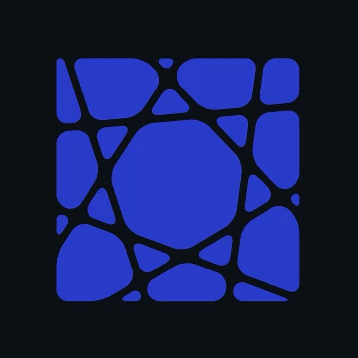 This image features an abstract, geometric pattern composed of irregularly shaped, interconnected blue polygons set against a dark background. The design utilizes negative space effectively to create a sense of structure and fragmented unity.