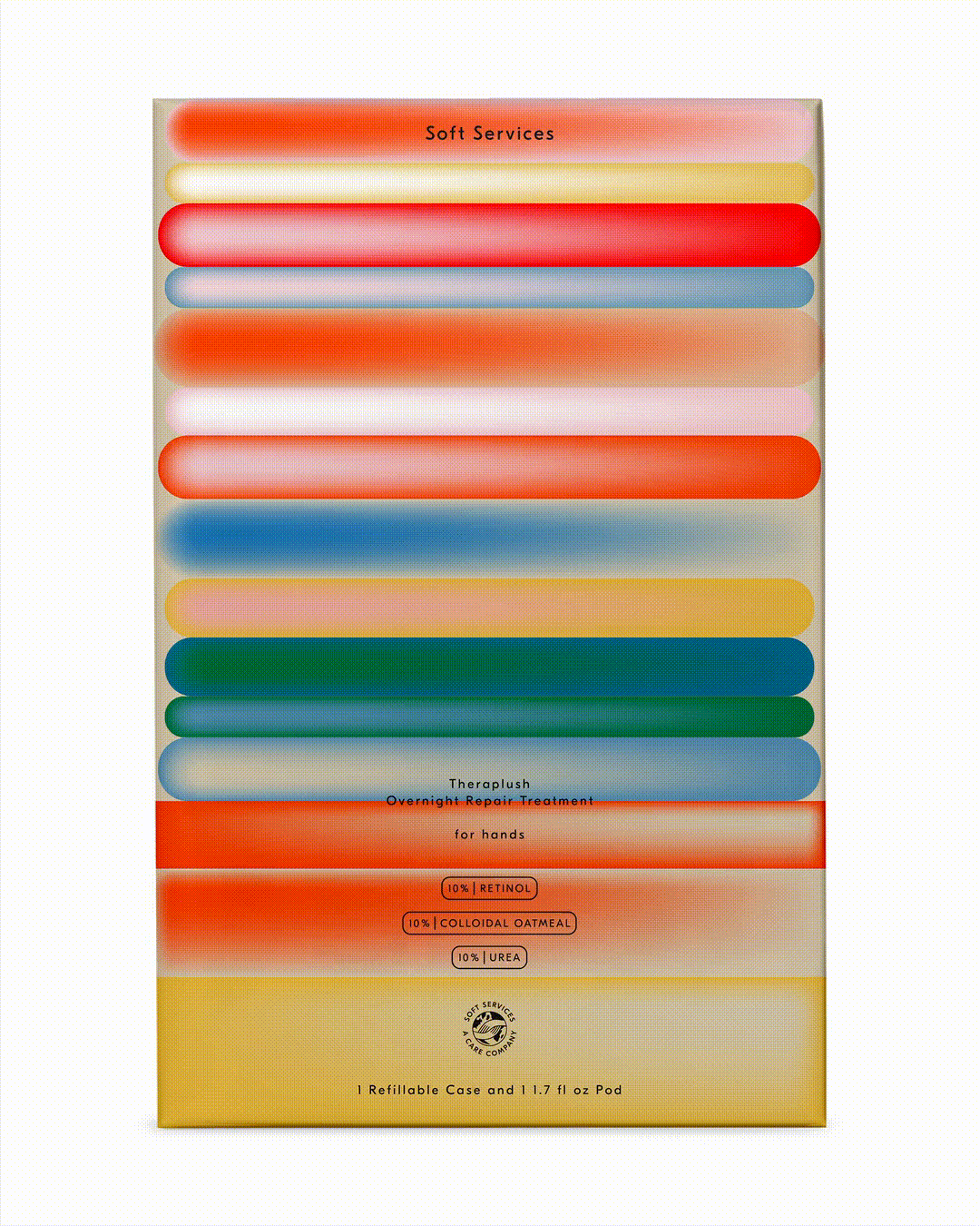 This image presents a clean, minimalist design for a set of cosmetic or therapeutic products, utilizing horizontal color bands to denote different services or treatments. The visual language is orderly and professional, relying heavily on color blocking for differentiation.