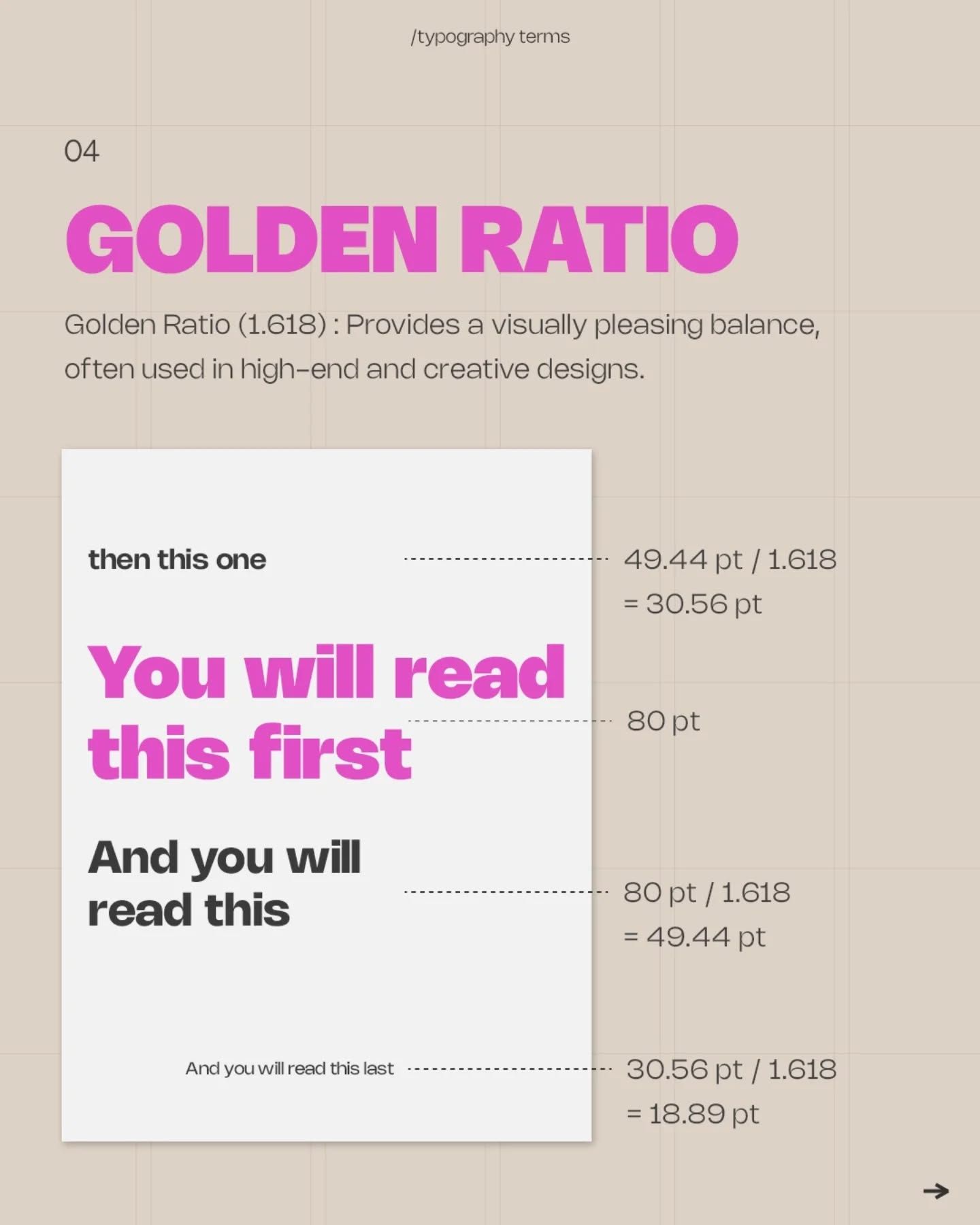 This image presents a clean, minimalist typographic exploration demonstrating the concept of the Golden Ratio (1:1.618) through text scaling. The design is highly structured, relying on precise alignment and proportional relationships to convey a sense of sophisticated, analytical design.