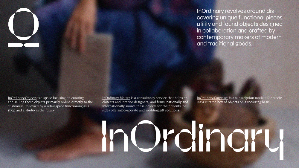 A sophisticated editorial design featuring the 'InOrdinary' brand with a minimalist aesthetic overlaid on a blurred, atmospheric background. The layout combines clean typography with subtle imagery and descriptive text, creating a contemporary, gallery-like presentation that emphasizes conceptual depth over visual clarity.