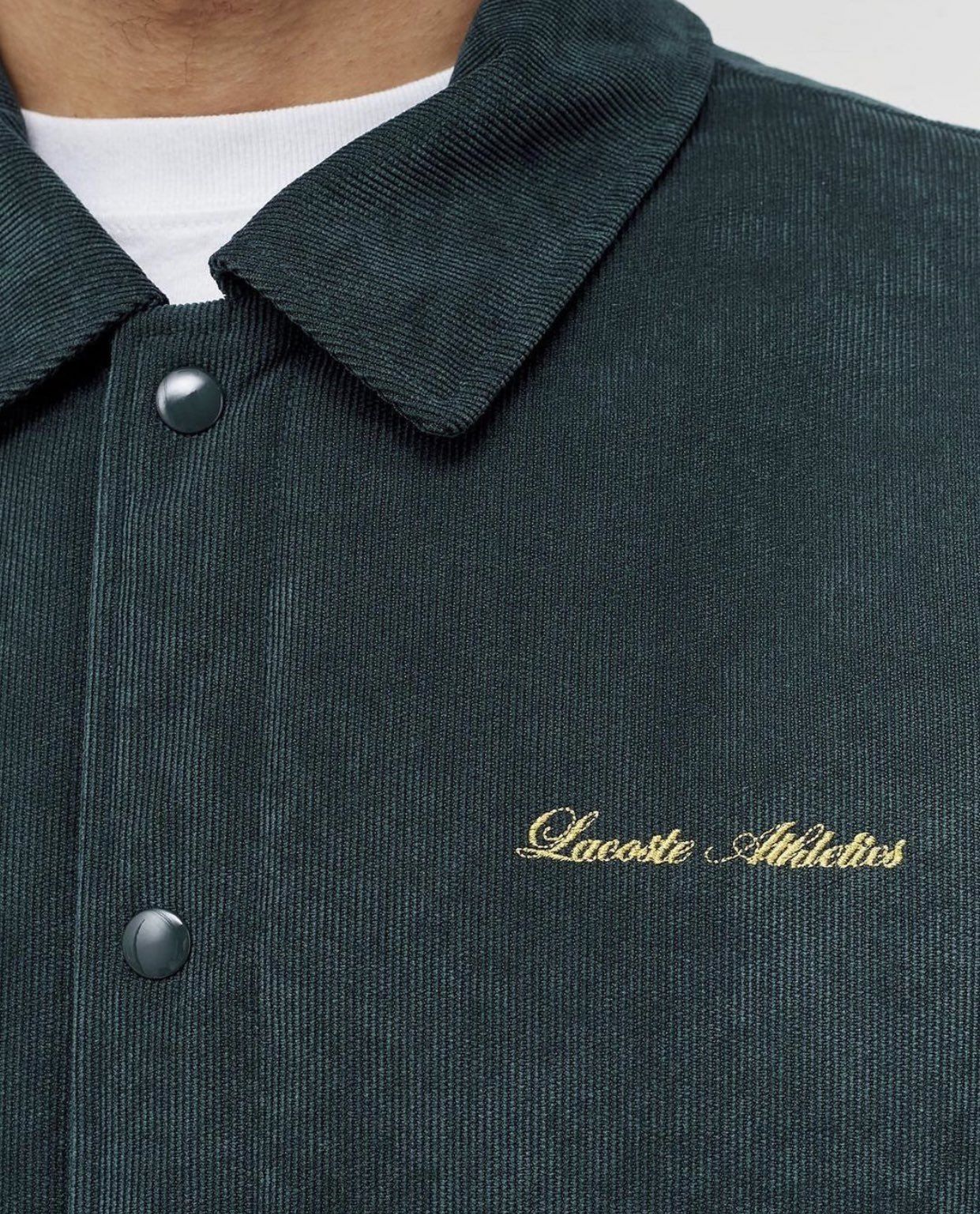 This image showcases a close-up of a dark pique fabric shirt or jacket, emphasizing classic sportswear details like the collar and stitching texture. The design relies on subtle branding to convey a sense of heritage and refined, understated athletic style.