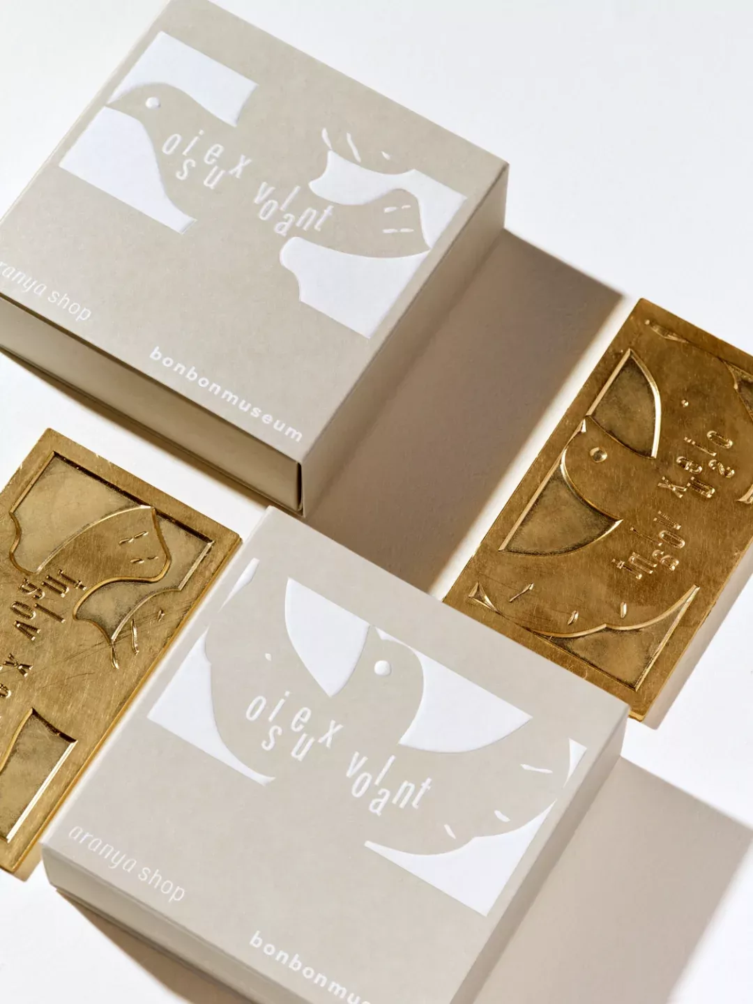 This visual showcases a highly refined and minimalist design approach, utilizing subtle texture contrasts between matte paper stock and elegant gold foil stamping. The visual language is clean and sophisticated, conveying a sense of bespoke quality suitable for luxury packaging or museum retail.