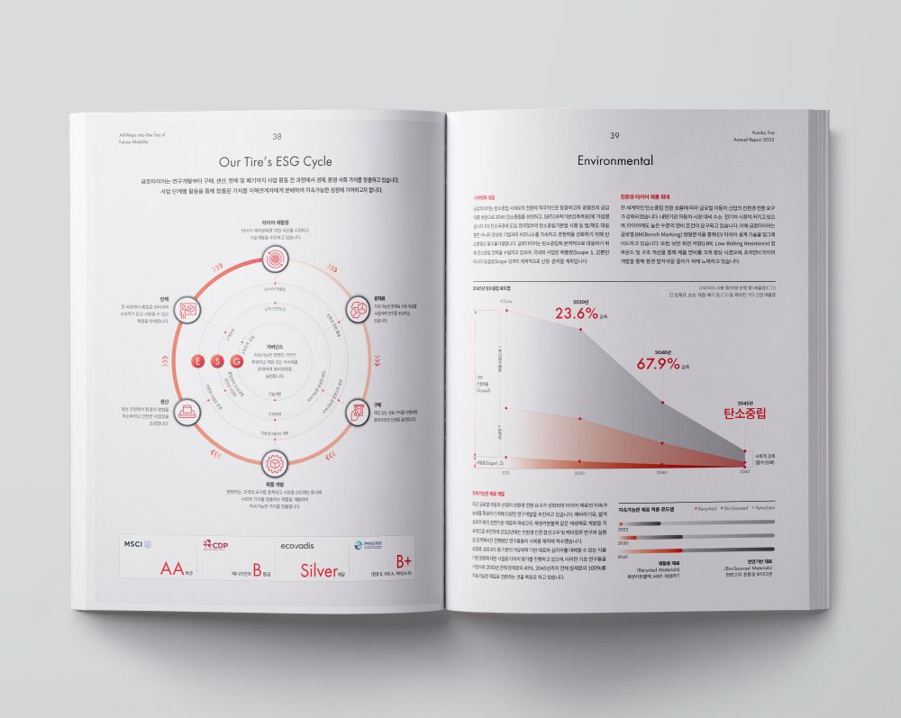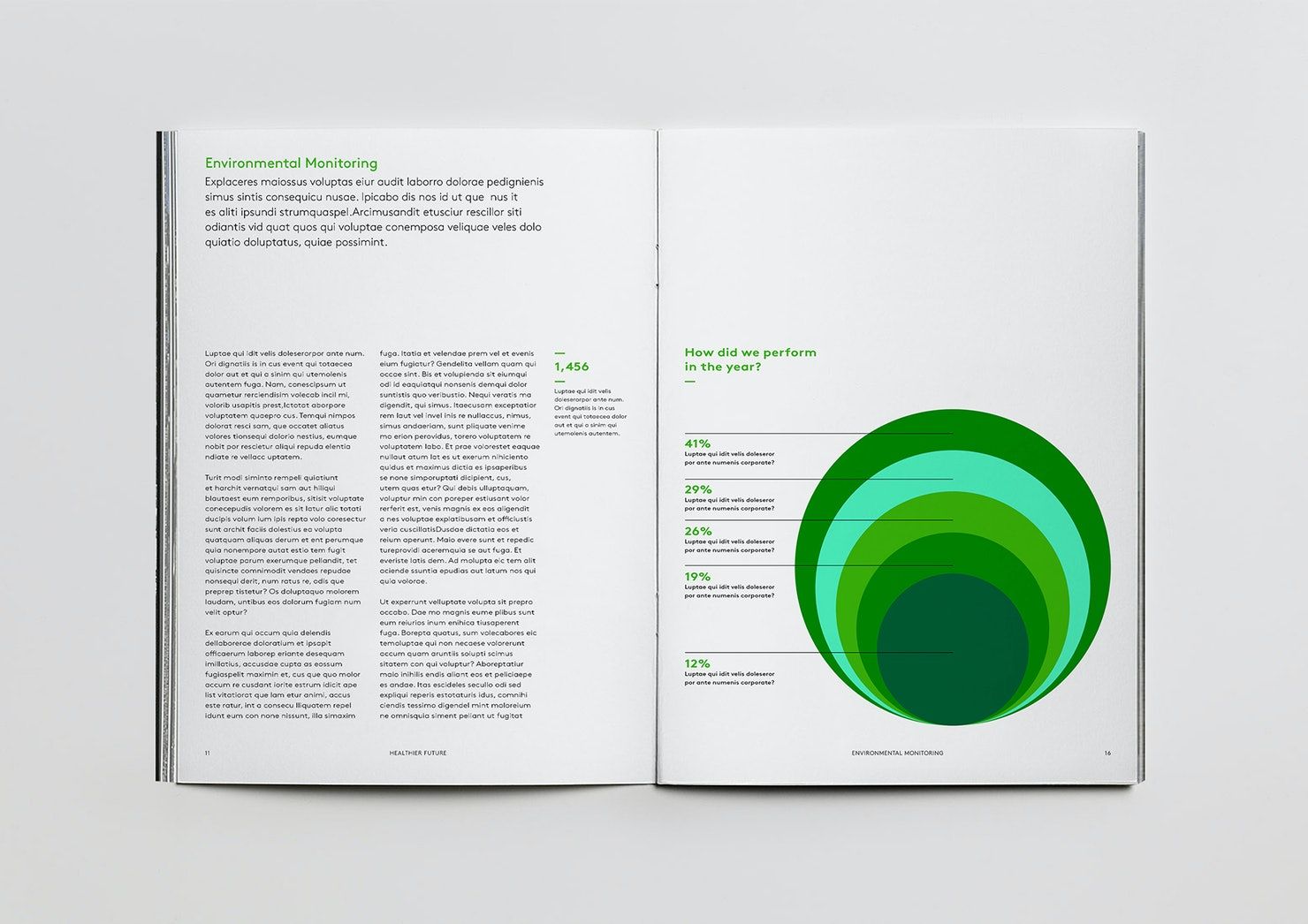 The image displays a professional, clean, and data-heavy report or publication spread, utilizing a minimalist design with a strong emphasis on circular diagrams and clear textual information. The visual language is corporate and analytical, aiming for credibility and detailed disclosure.