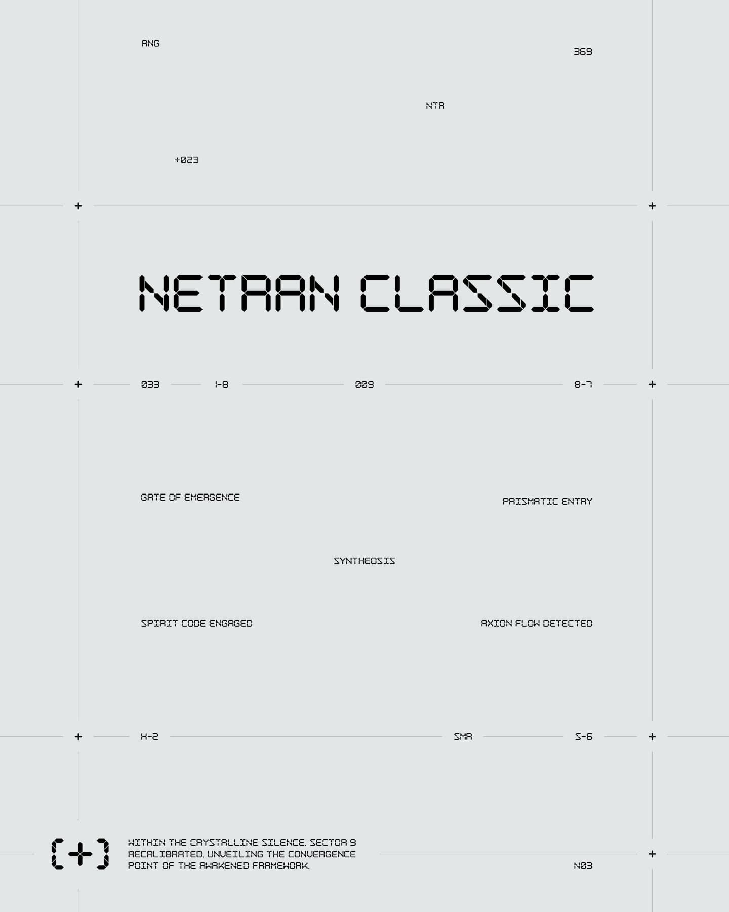A minimalist technical schematic or interface design featuring the bold headline 'NETRAN CLASSIC' centered on a light gray background. The layout employs a grid-based structure with scattered technical annotations, code references, and symbolic elements that evoke a retro-futuristic or early computer aesthetic.