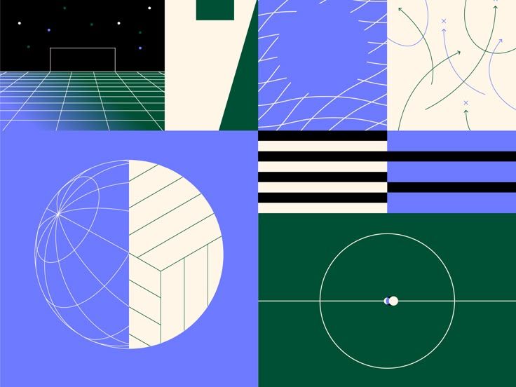 A geometric collage featuring a modernist aesthetic with split compositions, wireframe spheres, and architectural line work. The design combines retro-futuristic elements with clean minimalism, using a striking contrast between bold color blocks and delicate technical illustrations.