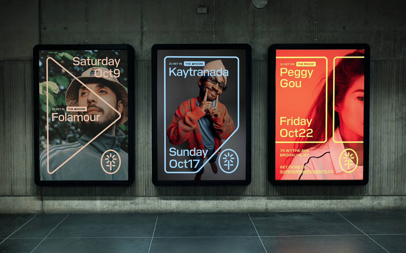 Three illuminated event posters displayed on a concrete wall, featuring bold neon-inspired typography and vibrant color blocking with photographic imagery. The design language combines modern minimalism with retro neon aesthetics, creating a striking urban nightlife atmosphere with geometric overlays and contemporary event branding.