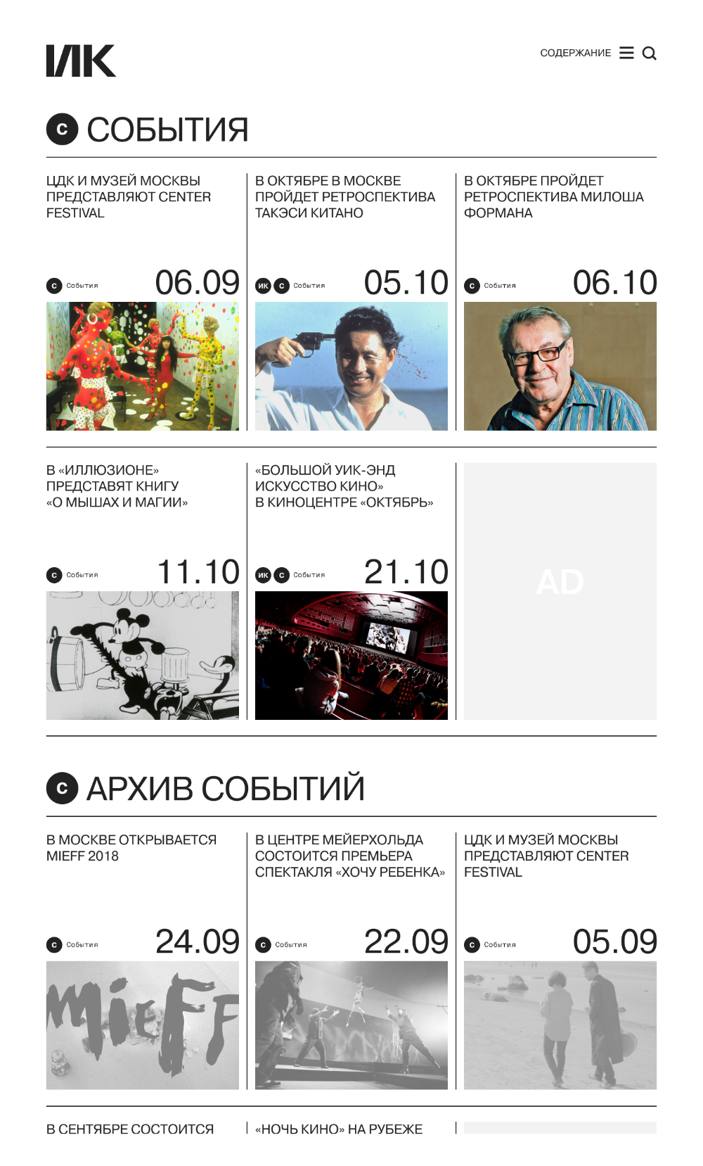 A minimalist editorial layout for an events or news platform with a clean grid structure showcasing upcoming events and archived content. The design employs a stark black-and-white color scheme with strategic use of imagery and typography to create visual hierarchy and guide user navigation.