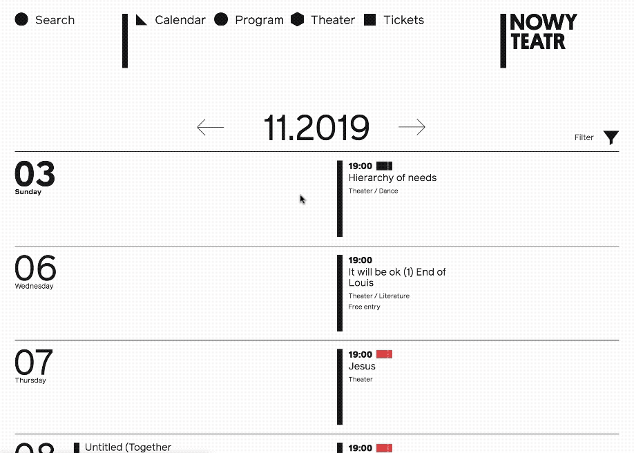 The image presents a minimalist, timeline-like graphic using simple geometric shapes to denote scheduled events. The design relies heavily on negative space and a clean, monochromatic aesthetic to convey information clearly and chronologically.