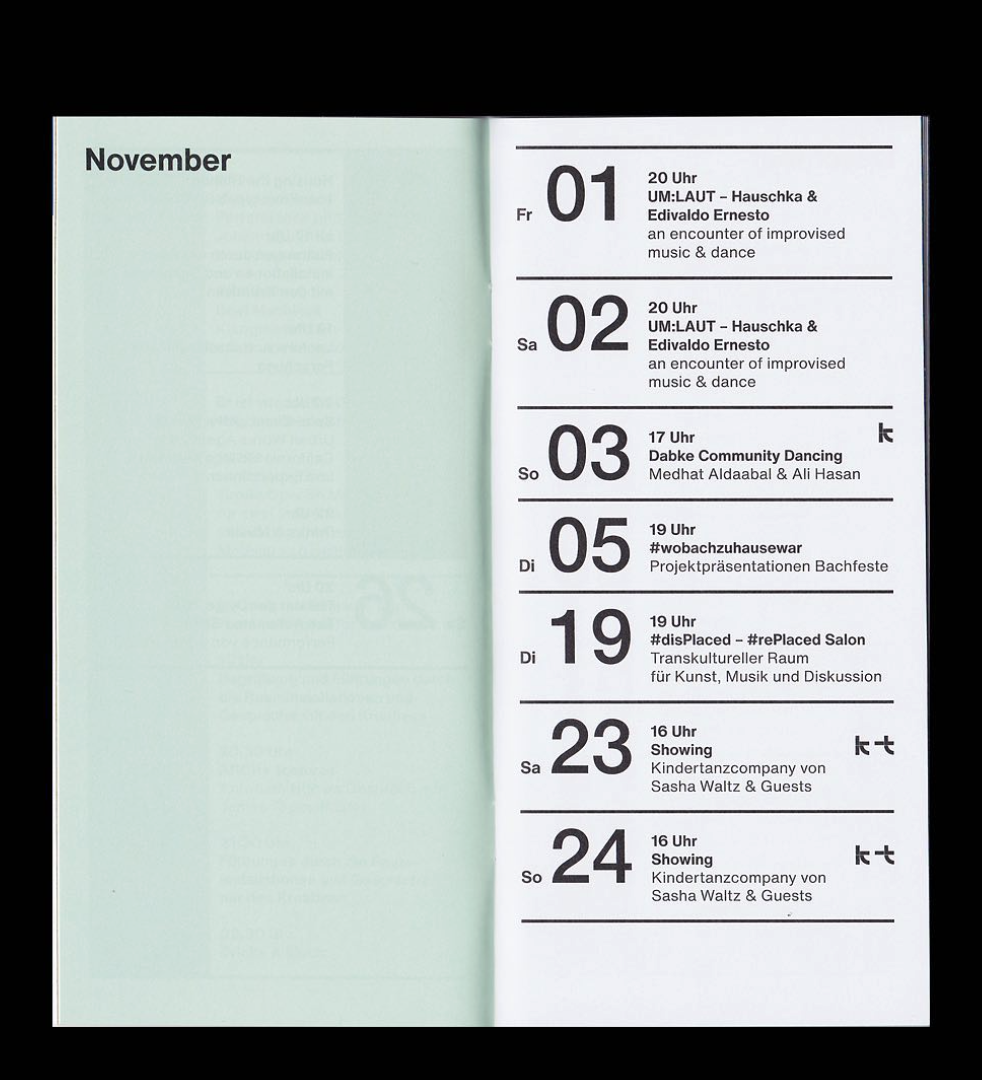 The design is minimalist and highly functional, employing a clean, high-contrast layout typical of an event or performance schedule. It uses ample white space to ensure readability and organizes information chronologically with clear visual hierarchy.
