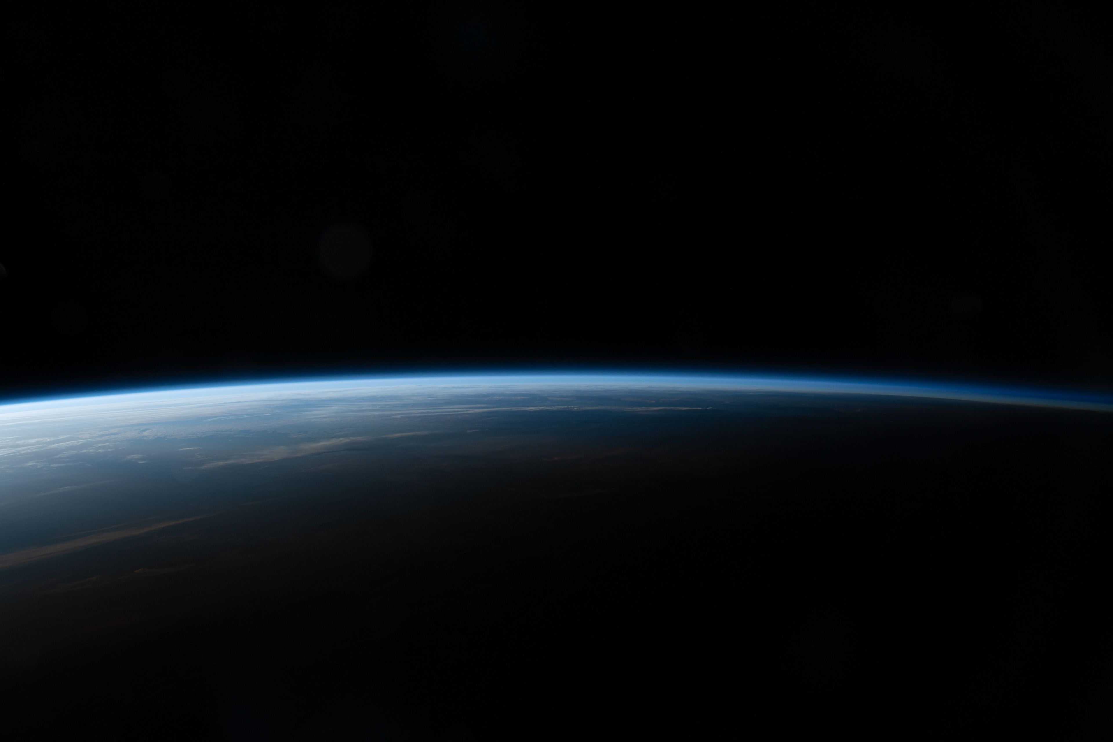 This image captures the delicate boundary between Earth's atmosphere and the vacuum of space, utilizing a stark contrast between deep blackness and the subtle blue glow of the limb. The visual language emphasizes scale, fragility, and the immense void surrounding our planet.