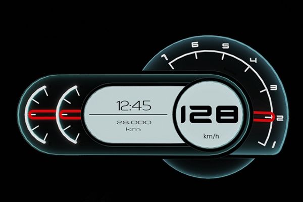 This image depicts a futuristic or digital speedometer interface, characterized by a dark background and glowing blue/cyan elements. The design uses a semi-circular gauge structure to display speed, suggesting a high-tech, performance-oriented aesthetic.