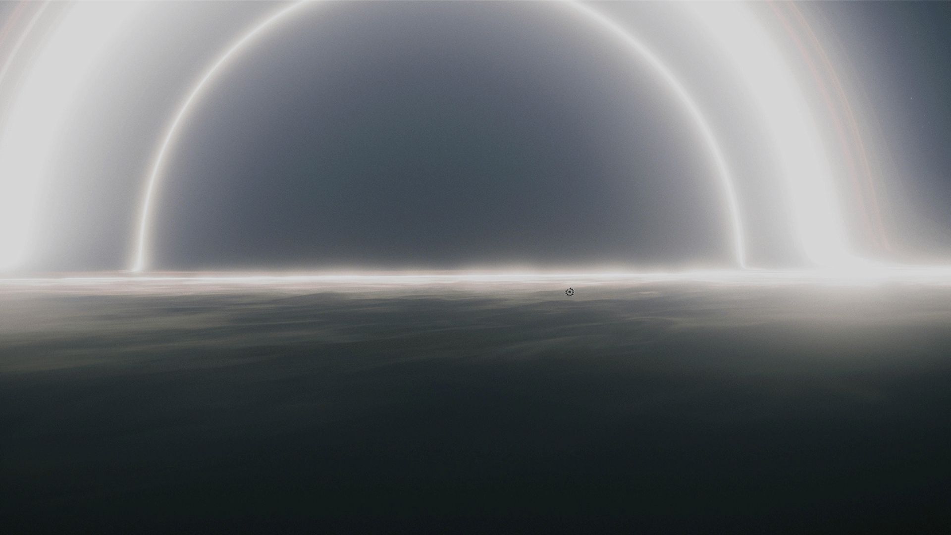 This image presents a stark, high-contrast depiction of a planetary or stellar environment, dominated by a massive atmospheric body curving across the frame. The visual language is minimalist and dramatic, relying on gradients of light and shadow to create a sense of immense scale and isolation.