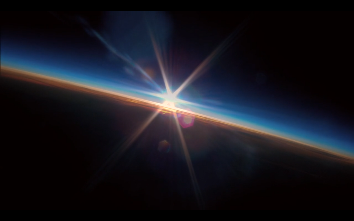 This image captures a dramatic view of the Earth's limb against the blackness of space, highlighting the thin blue atmosphere and a brilliant solar flare or atmospheric glow. The visual language is stark, emphasizing the contrast between light and deep shadow.