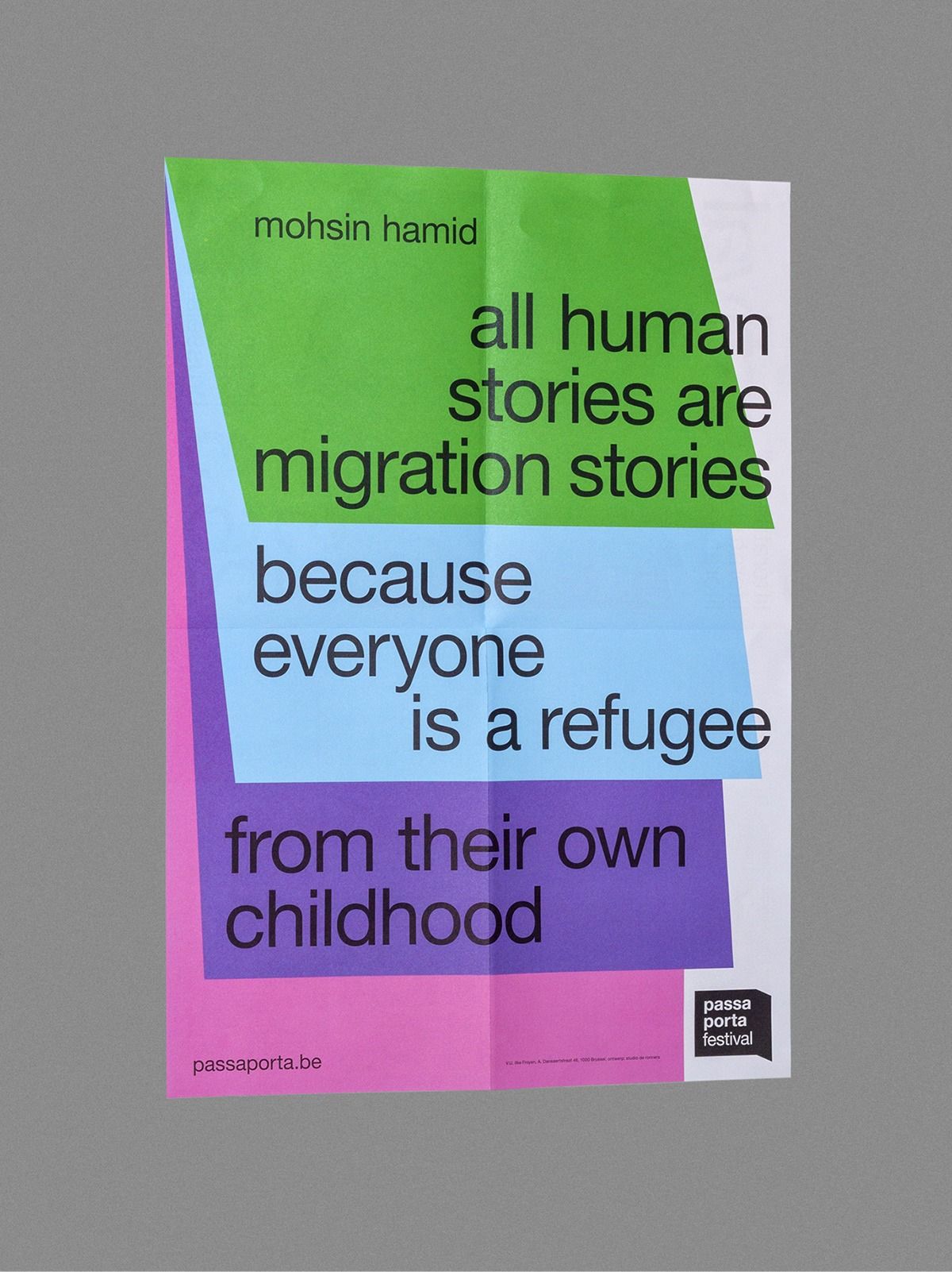 This design utilizes a bold, modular color-blocking technique to present a profound social commentary. The visual language is clean and direct, using distinct color fields to segment and emphasize the layered message about migration and refugee experiences. The composition is strong, relying on vertical stacking to guide the viewer through the thematic progression.