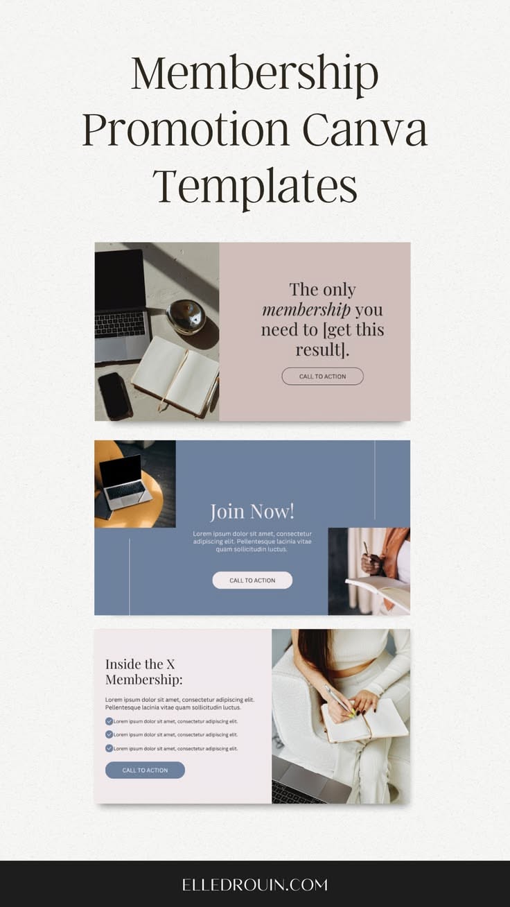 This set of templates exhibits a clean, minimalist aesthetic suitable for professional promotional content. The design relies heavily on soft neutral tones and simple typography to convey trustworthiness and clarity for membership services.