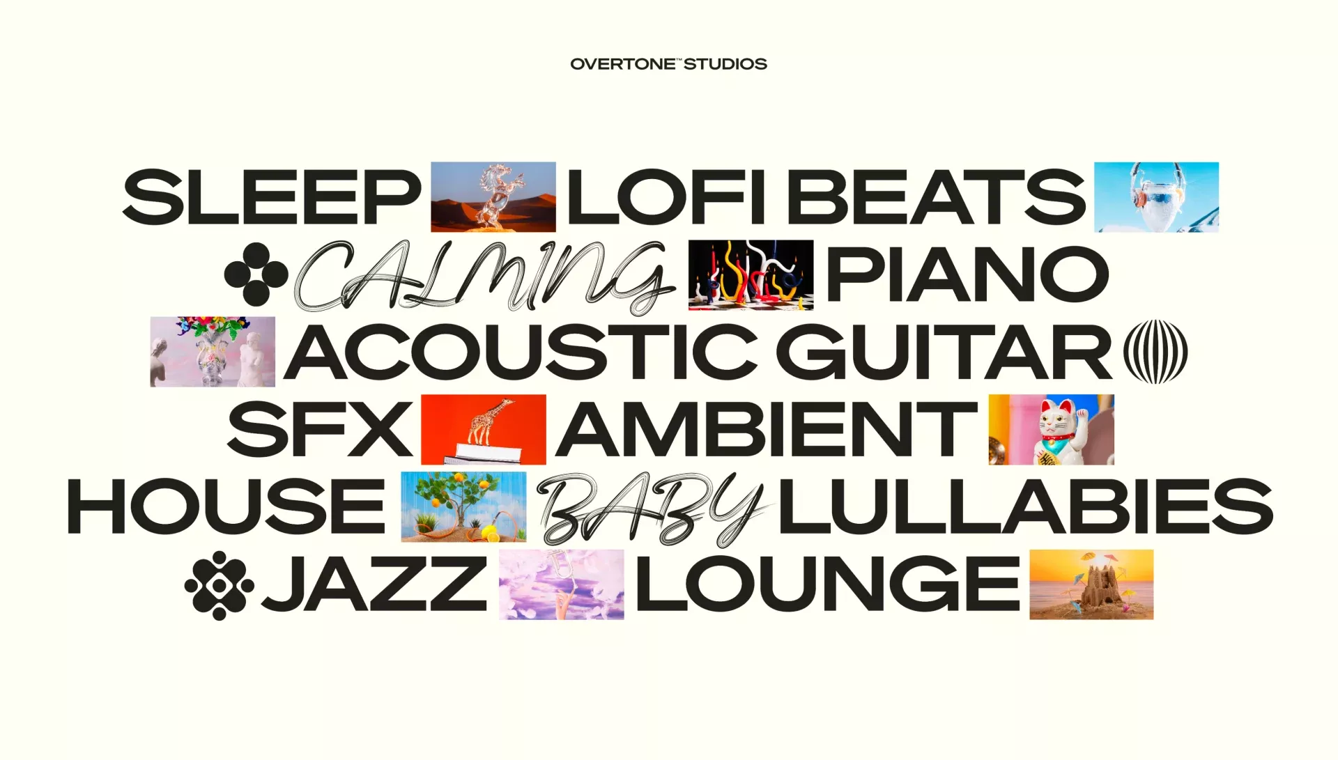 This is a text-heavy, minimalist logo or branding display featuring various musical and sound production terms arranged in a horizontal line. The design relies on strong, bold typography contrasted with small, evocative photographic icons to suggest a diverse yet cohesive sonic palette.