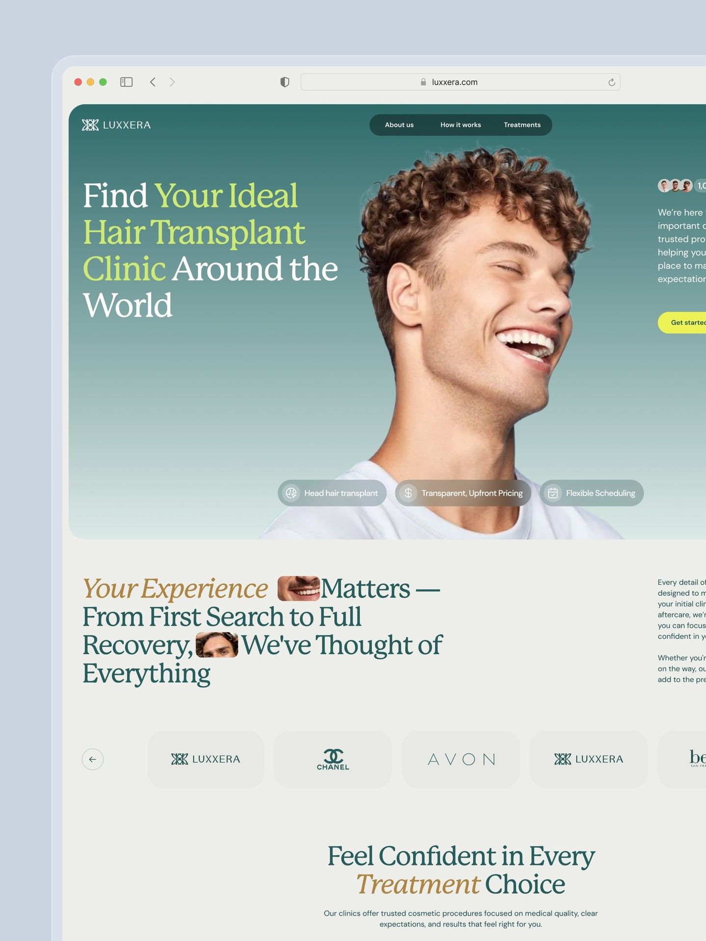 The design is clean, modern, and professional, utilizing a light, airy aesthetic with soft greens and whites to convey trust and expertise. The layout is spacious, focusing attention on the central model and clear calls to action implied by the navigation.