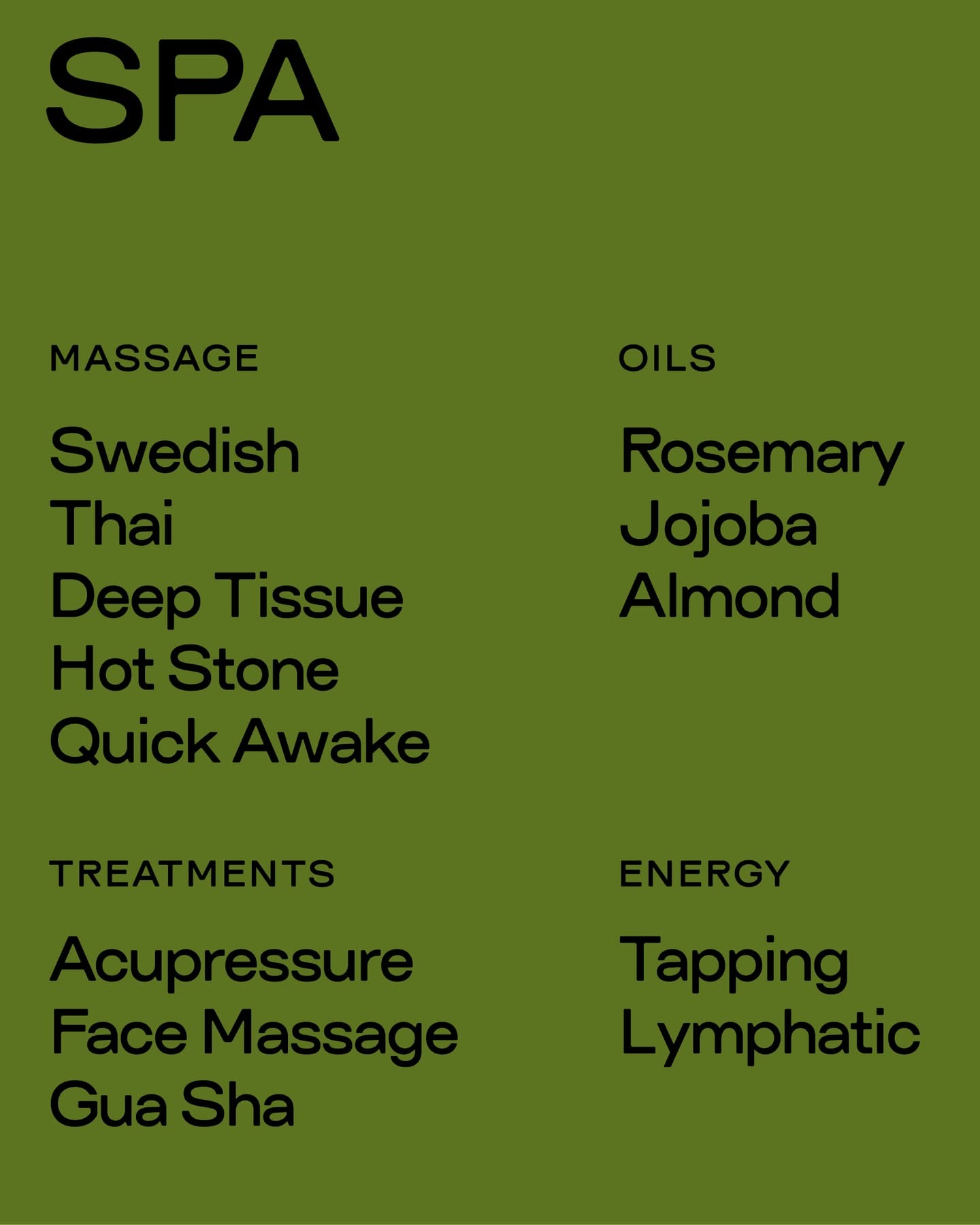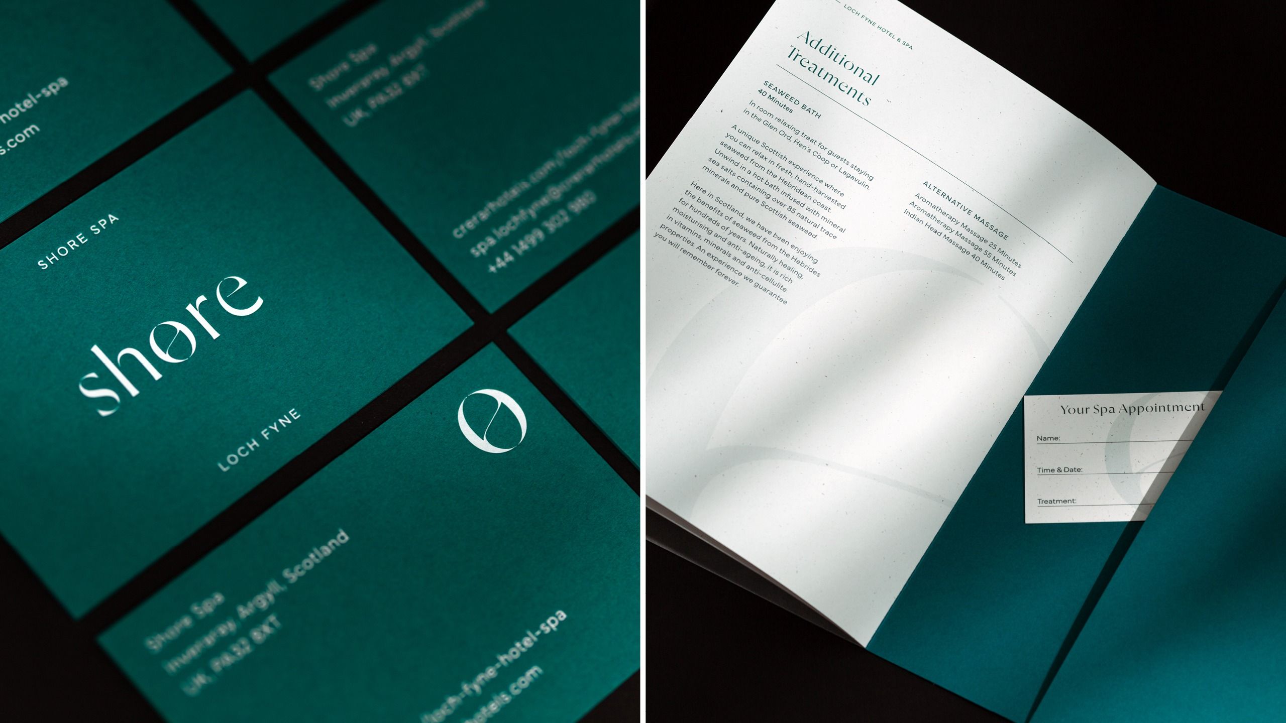 The image presents a sophisticated and minimalist design, likely for a spa or wellness service. It utilizes a deep teal/green color paired with clean white space to convey luxury, tranquility, and professionalism.