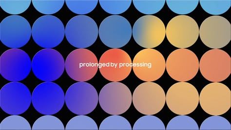 This image features a highly structured grid composed of circular elements demonstrating smooth color gradients, creating a spectral and organized visual rhythm. The design utilizes deep contrast with a black background to emphasize the flow and transition between cool blues and warm oranges.