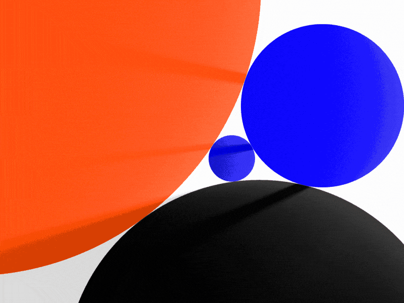 This image features a bold, abstract composition using large, overlapping circles and a strong gradient effect. The design relies on high contrast between warm orange, deep blue, and stark black against a white background to create a dynamic and modern visual statement.