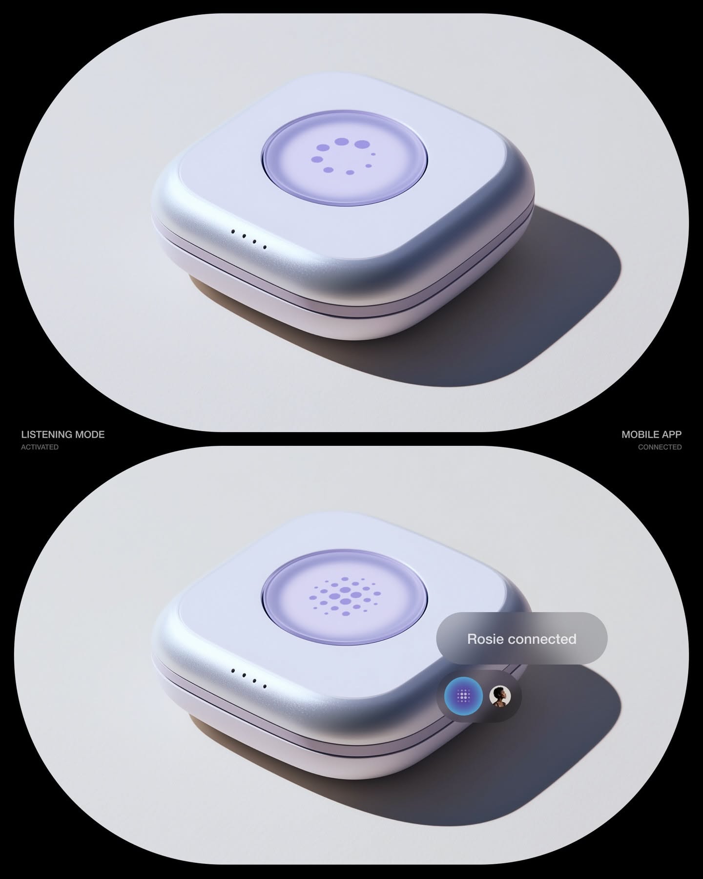 This image showcases a clean, modern electronic device with smooth, rounded contours and a minimalist aesthetic. The visual language emphasizes simplicity, high-quality manufacturing, and subtle functional cues through color accents.