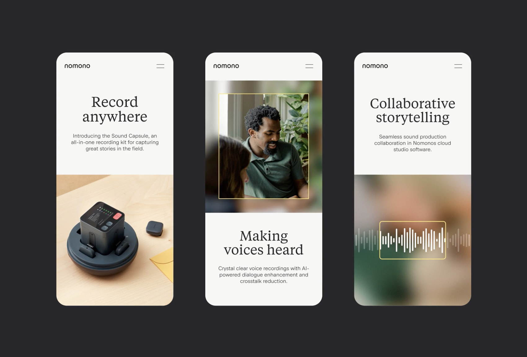 This design employs a clean, minimalist aesthetic characterized by soft, earthy tones and ample white space, effectively conveying professionalism and technical sophistication. The visual language is highly focused on showcasing product benefits related to audio collaboration and recording technology.