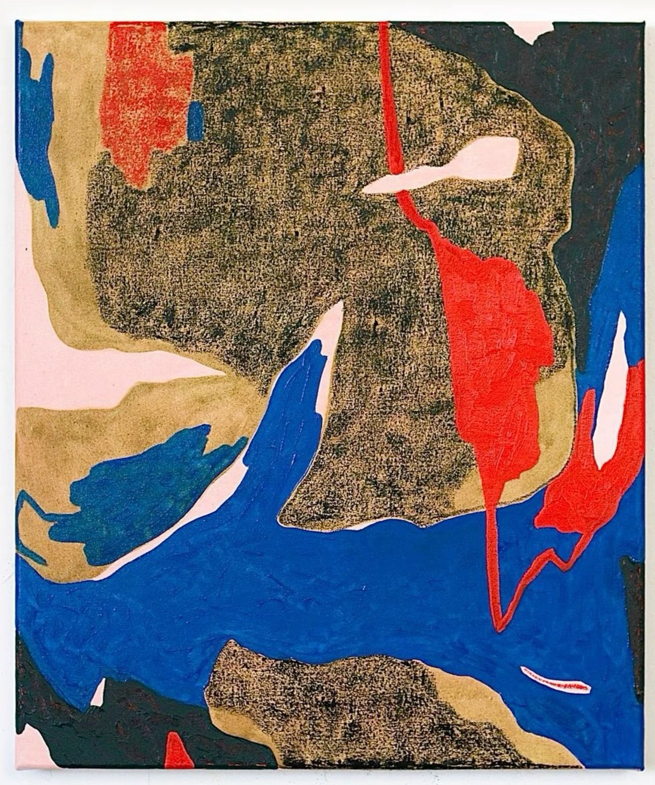 This abstract composition utilizes heavy texture and bold, saturated color fields to create a dynamic interplay between dark masses and vibrant accents. The visual language is gestural and layered, emphasizing the physicality of the paint application and the tension between cool blues and fiery reds.