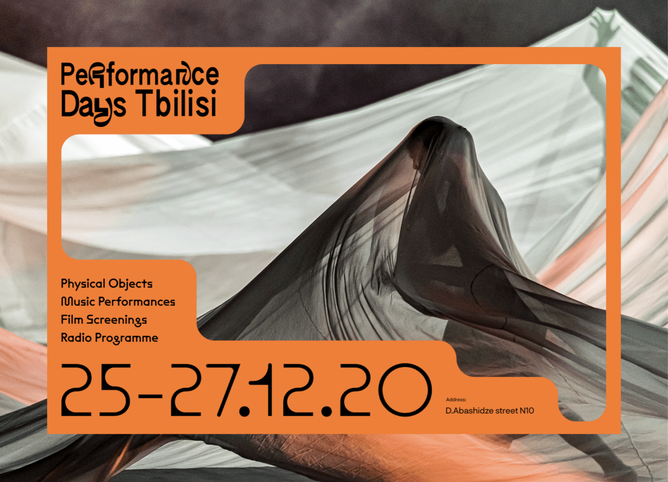 This design utilizes soft, flowing textures and muted tones to create an elegant and atmospheric invitation for a cultural event. The visual language emphasizes movement and depth through the draping fabric, balanced by clean typography and a strong, warm color accent.