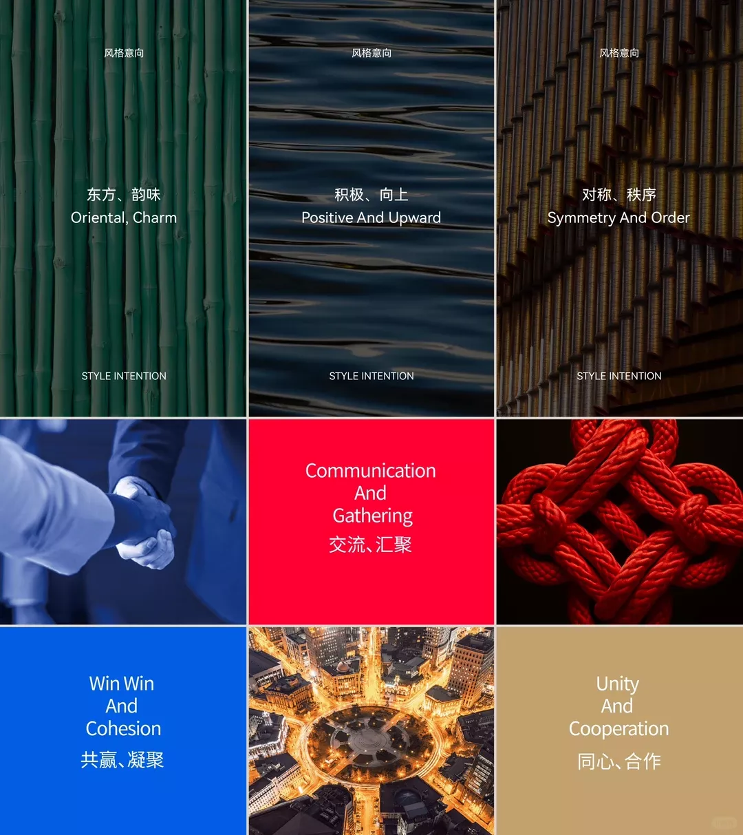 A sophisticated mood board featuring nine thematic panels that blend natural textures, abstract photography, and symbolic imagery with bilingual typography. The design employs a grid-based layout with contrasting color blocks and layered visual metaphors to communicate concepts of harmony, communication, and cooperation.