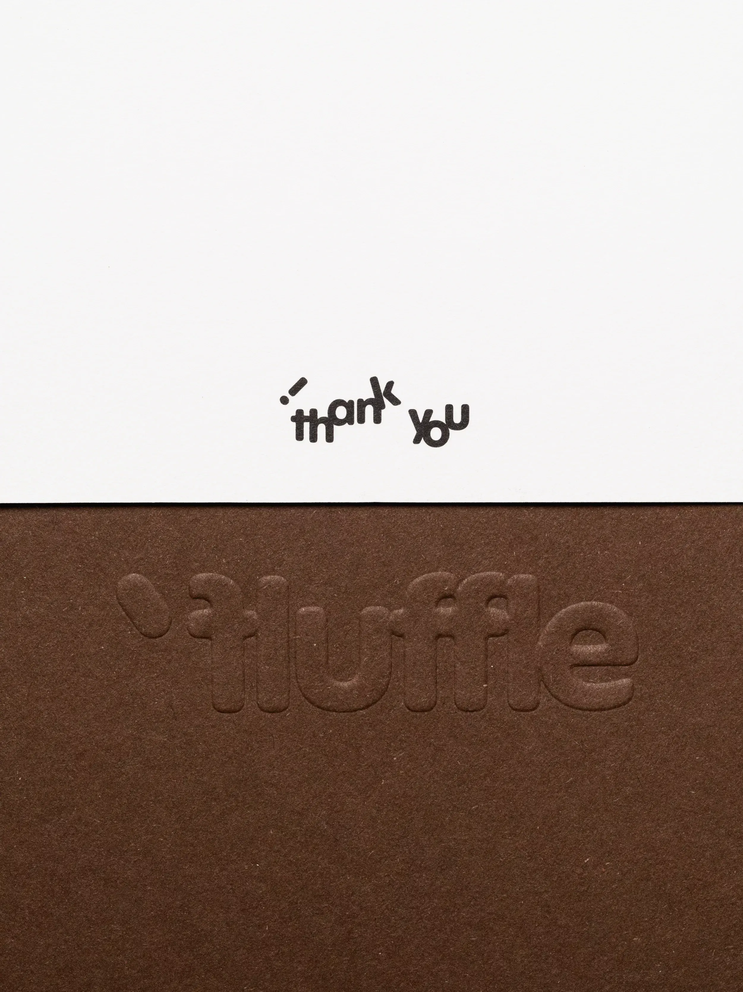 A minimalist design split into two distinct zones: a light upper section with handwritten-style text reading 'thank you,' and a rich brown lower section featuring embossed typography spelling 'iluffe.' The composition creates a subtle contrast between casual gratitude and refined branding through material and textural differentiation.