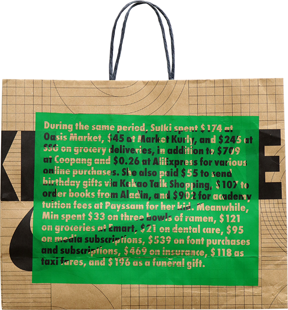 This image presents a personal, archival document—a handwritten financial list—set against a textured, structured background. The design utilizes high contrast between the vibrant green ink and the muted earth tones of the paper and surrounding structure, lending it a personal yet organized feel.