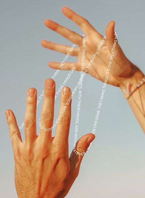 A contemporary conceptual photograph featuring two hands against a soft gradient background with overlaid white text running vertically along the fingers. The image combines minimalist photography with typographic elements to create a thought-provoking visual statement about communication, connection, or digital interaction.