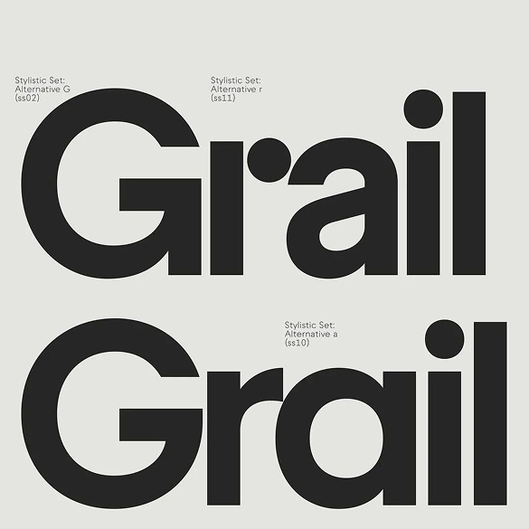 A typographic study showcasing two variations of the word 'Grail' in bold, geometric sans-serif letterforms against a neutral beige background. The design demonstrates systematic font exploration with labeled stylistic alternatives, emphasizing clean lines and consistent stroke weight throughout.