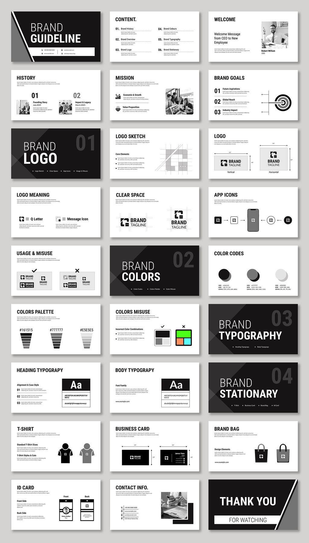 This design presents a highly structured and minimalist approach to brand guidelines, utilizing ample white space and clear sectioning to ensure readability. The visual language is clean, professional, and modern, relying on strong typographic hierarchy and a restrained color palette to convey authority.