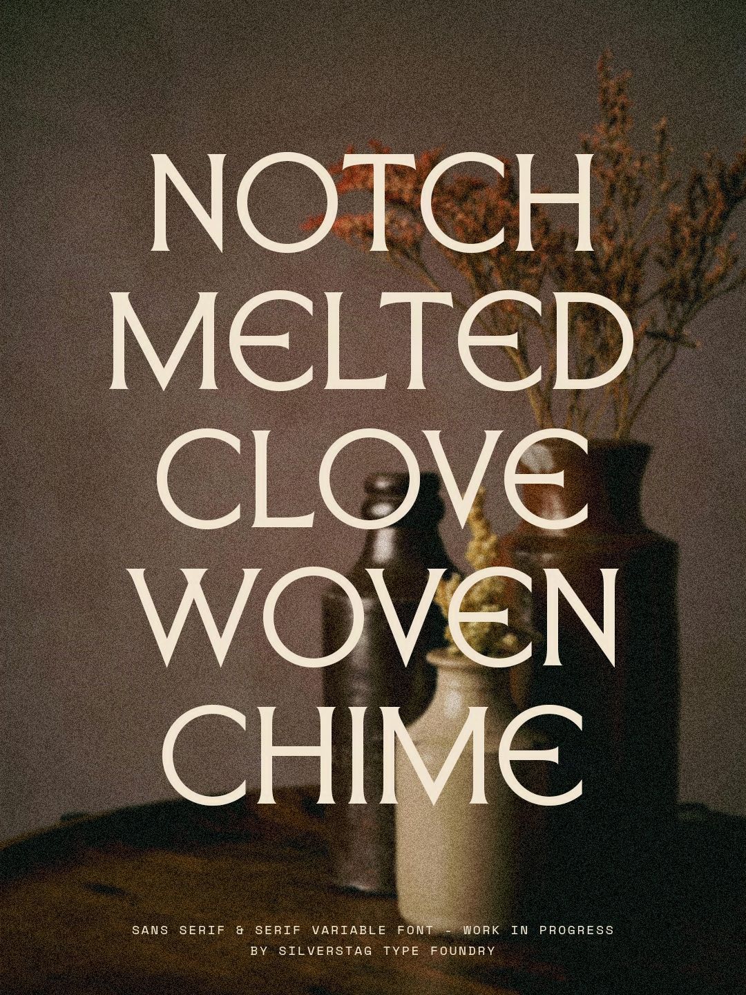 A moody, artisanal typography poster featuring stacked sans-serif text overlaid on a styled still life composition with dried botanicals and ceramic vessels. The design blends contemporary minimalism with warm, earthy aesthetics, creating an introspective and craft-focused visual narrative.