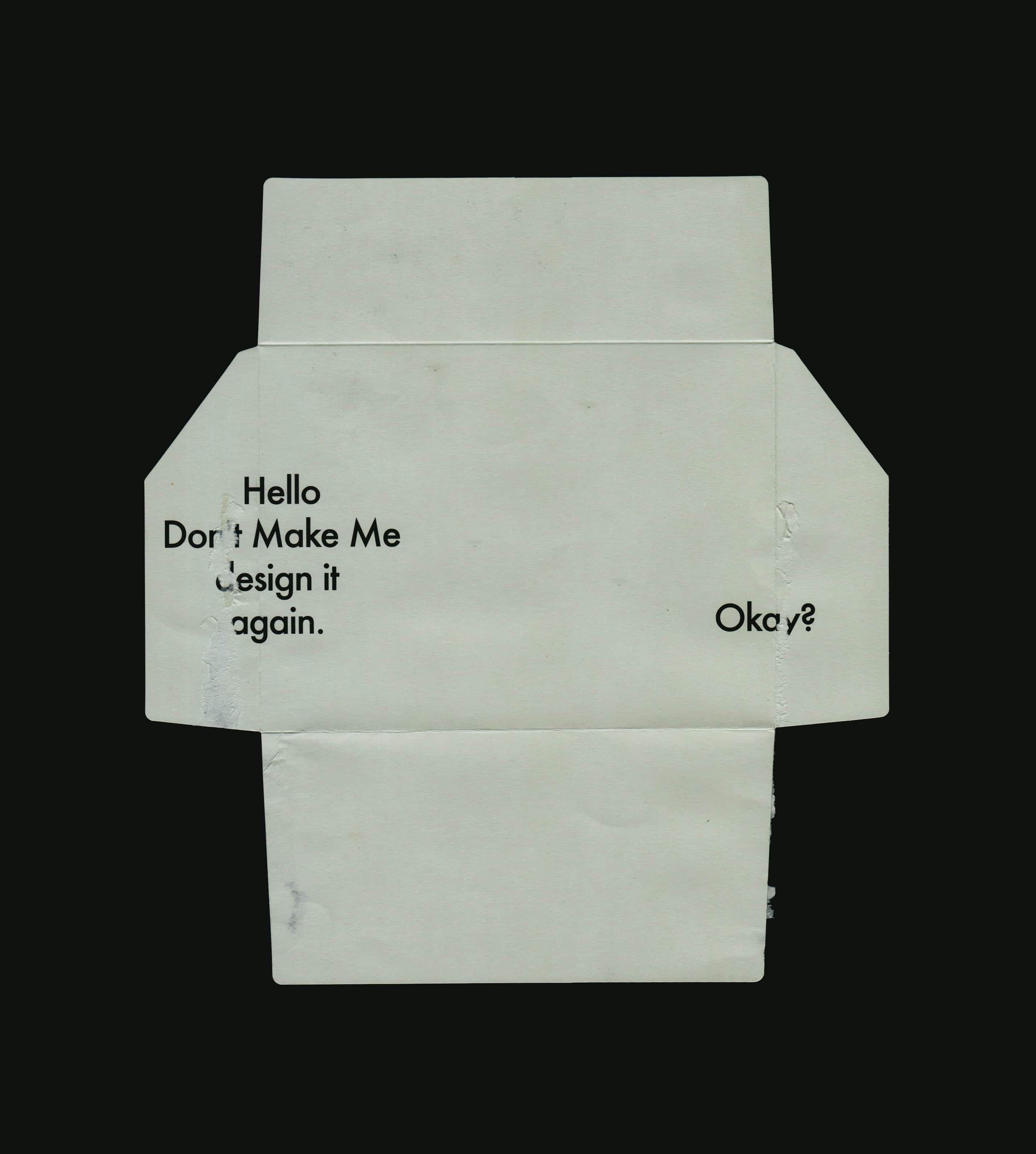 A minimalist, conceptual design featuring a deconstructed envelope or box form with handwritten text expressing creative frustration. The piece uses a stark contrast between off-white textured material and deep black background, creating a contemplative and somewhat humorous visual statement about design iteration and client communication.