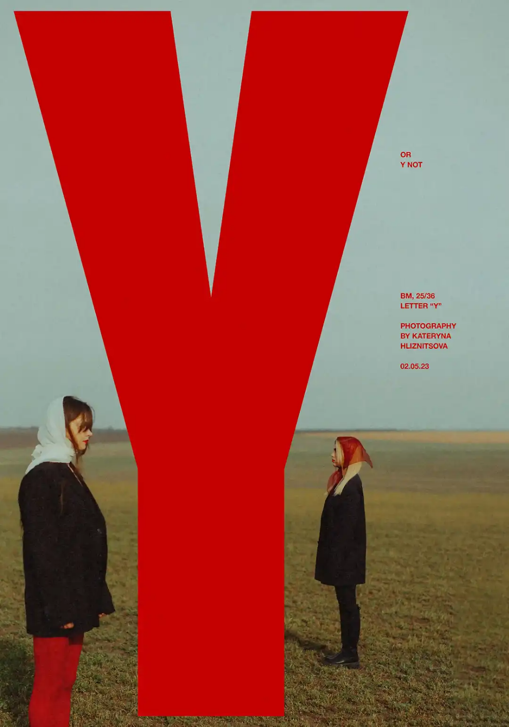 A bold, minimalist design featuring a massive red 'Y' dominating a muted landscape with two figures positioned at its base. The composition creates striking visual contrast between the geometric abstraction and the naturalistic setting, evoking conceptual art photography.