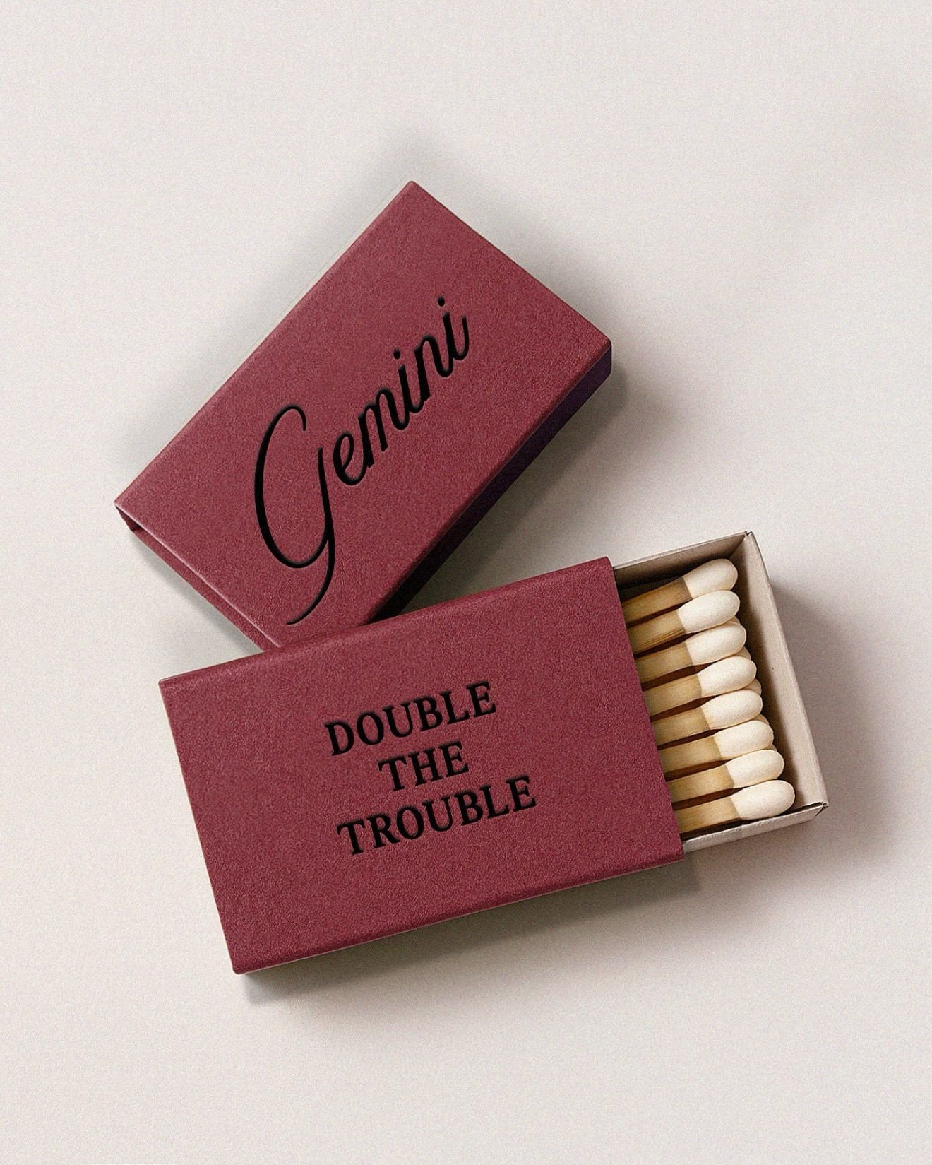 A minimalist matchbox design featuring a burgundy-red cardboard box with elegant black typography. The composition showcases both closed and open states, revealing wooden matches inside, with a clean, sophisticated aesthetic that emphasizes typography and material texture.