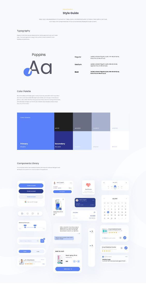 A comprehensive design system documentation page showcasing a modern, minimalist visual language built around a vibrant blue primary color. The layout presents typography guidelines, color palettes, and UI component examples in a clean, organized grid structure that emphasizes clarity and systematic design thinking.