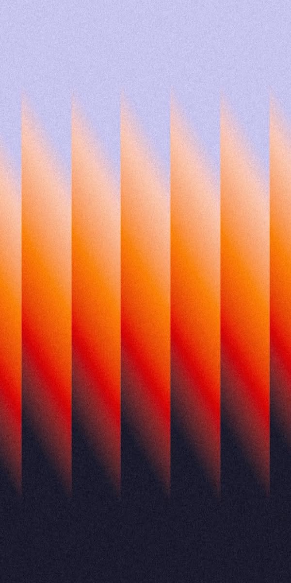 This image features a strong vertical striped pattern created by gradients of warm orange and red light cutting through a soft, pale blue background. The design evokes a sense of light shafts or shadows cast across a surface, creating a dynamic yet serene visual rhythm.