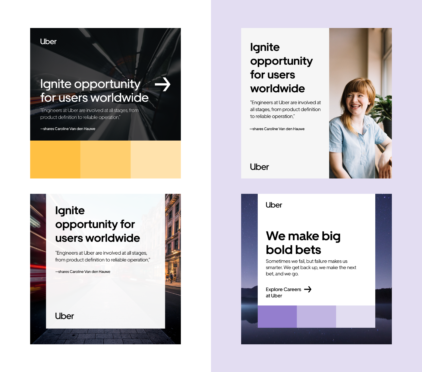 This set of panels utilizes a clean, modern aesthetic with high contrast to convey corporate ambition and opportunity. The design relies on strong typography, strategic use of space, and juxtaposed imagery to create an inspiring yet professional tone.