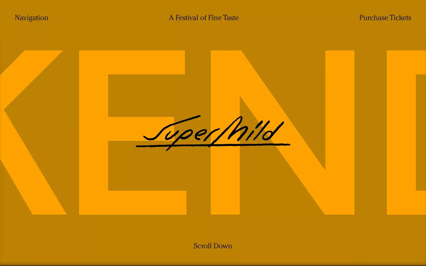 The design is minimalist and bold, utilizing a strong monochromatic palette dominated by warm ochre tones. It employs large, sans-serif typography to create a strong visual impact, suggesting a premium or high-end experience.