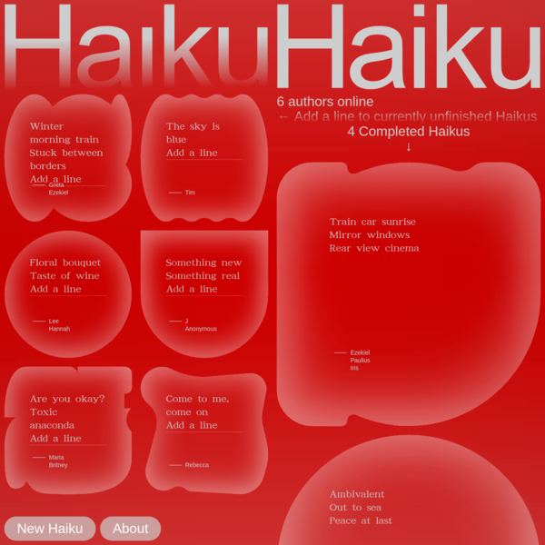 The design features a bold, warm red background with rounded, organic shapes used as containers for text entries, suggesting a personal or creative collection. The layout is modular and emphasizes individual contributions within a unified, slightly rustic aesthetic.