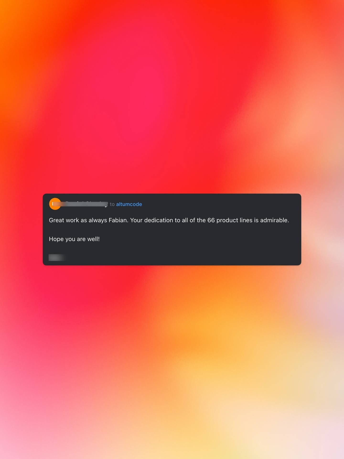 The image features a vibrant, soft gradient background transitioning smoothly from deep magenta on the left to warm orange and yellow on the right. A dark rectangular notification box is placed prominently in the center, providing a strong contrast against the luminous backdrop.