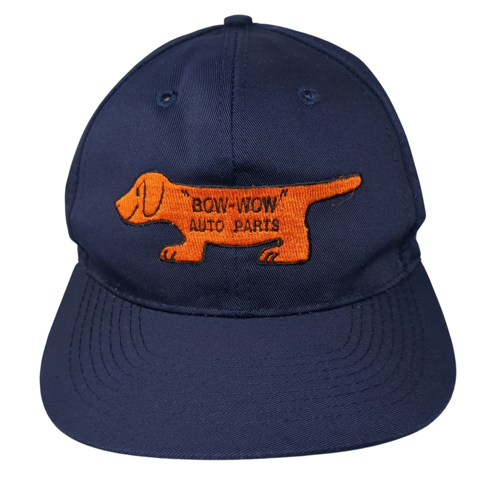 This design features a classic baseball cap silhouette utilizing a high-contrast color scheme. The embroidered logo, depicting an animal silhouette and text, grounds the nautical navy fabric with a vibrant, earthy orange accent. The overall feel is rugged yet casual, suggesting a vintage or workwear aesthetic.